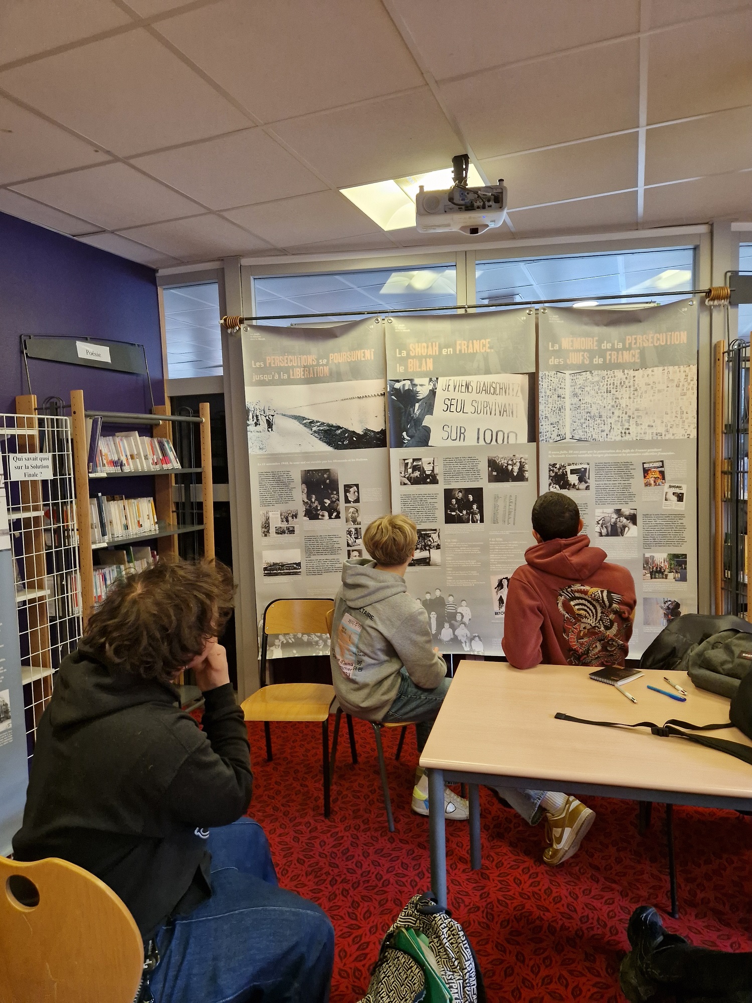 Elle est composée de 20 panneaux qui abordent les différents aspects du sujet. Plusieurs d’entre eux ont particulièrement retenu l’attention des élèves, en lien avec le sujet du CNRD : « les persécutions se poursuivent à la libération », « la shoah en France, le bilan » et « la mémoire de la persécution des juifs en France ».
